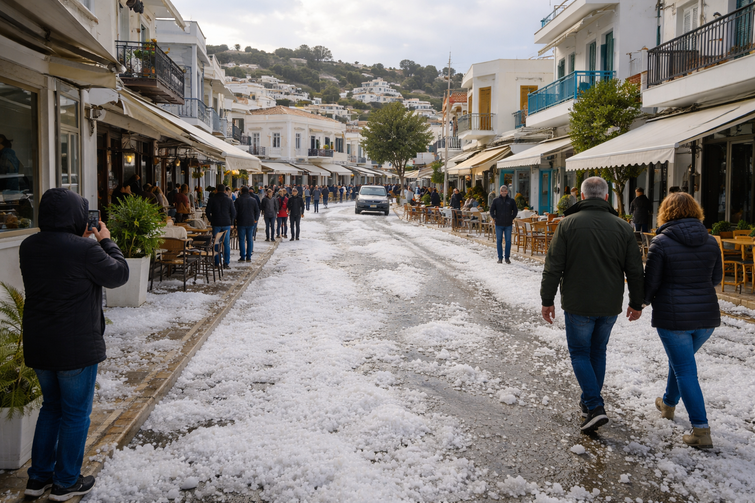 • Το χαλάζι έπεφτε με ένταση, καλύπτοντας μέσα σε λίγα λεπτά τους δρόμους και τις αυλές των σπιτιών.